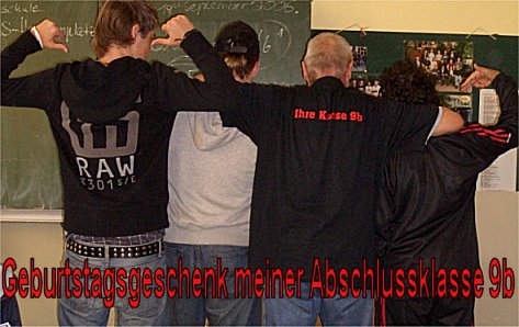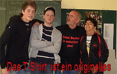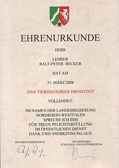 Als Lehrer war ich ein Dinosaurier an einer aussterbenden Schulform, der Hauptschule! Mir machte der Beruf meistens Spaß, und das seit 1968.... ( Jahr der "Gründung" der HS in NRW) : das waren schließlich über 40 Jahre "Öffentlicher Dienst", besiegelt durch eine Urkunde, die ich allerdings selber anfordern mußte. Doch was sind 40 Jahre "Öffentlicher Dienst" ( 32 Jahre davon an der "Montessori - Hauptschule Hermannplatz" in Düsseldorf ) - gegen einen Sympathiebeweis von jungen Menschen in Form eines so originellen Geschenkes - in Form eines T-shirts - wie abgebildet, das mir meine Abschlußklasse schenkte. Für mich: viel mehr wert als jede Urkunde! Im Jahre 2007 "hatte ich dann fertig". Ich trat in den freiwilligen vorzeitigen Ruhestand nach 44,23 :-) Jahren Dienst am Staat. Meine Lieblingsfächer waren Musik und Physik. Ich selbst spiele bis heute privat so ab und zu in der Öffentlichkeit: Repertoir von 1955 bis 2000. Durch die Bundeswehr und auch die Physik bin ich u.a. zum Amateurfunk gekommen, den ich seit 1977 als Hobby und auch Schulfach betrieben habe. Ich hoffe, daß ich in all den Jahren doch hin und wieder besser gewesen bin als viele "meiner Lehrer": schließlich war dieses Ziel Grund für mich, den Beruf zu ergreifen. Etwas neugierig geworden???? Dann weiter!!!! |