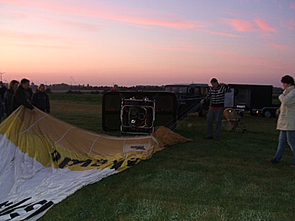 Von meiner Ex-Klasse 9 bekam ich zur Verabschiedung in den Ruhestand eine Heißluftballonfahrt mit der Firma "Skytours Ballooning" geschenkt. Nach telefonischer Terminabsprache wollte ich diese am 07.08.07 antreten, am 2-ten Schultag nach den Sommerferien. Meine Ex-Klasse wollte ja dabei sein, und die SchülerInnen hatten sogar frei bekommen dafür. Gut: den zusätzlichen Ferientag hatten sie bekommen, doch aus der Fahrt wurde nichts. Das Wetter machte einen Strich durch die Rechnung: nach 3 Tagen Sommerhoch mit über 30 Grad kam ein "kleines Tief" von Westen. Und anstelle der endgültigen Terminbetätigung am Vorabend per SMS durch den Ballonpiloten bekam ich die Nachricht auf mein Handy geschickt: "Die Ballonfahrten morgen früh können leider wegen Niederschlägen nicht stattfinden. Bitte melden Sie sich bei der Terminberatung......." Das tat ich dann am nächsten Tag. Damit nicht wieder Unterricht ausfallen mußte, legte ich diesmal den Termin in die Herbstferien, auf den 24.09.07, den ersten Ferientag. An diesem Tag sollte das Wetter laut Vorhersage morgens trocken, heiter und warm sein. Leider erheilt ich am 23.09.07 um 20:52:31 h die SMS: "Aufgrund deutlicher Windzunahme müssen wir leider Ihre Ballonfahrt morgen früh absagen." Also: dritter Versuch. Diesmal konnte ich natürlich auf Ferienordnungen keine Rücksicht mehr nehmen, denn dann hätte ich die Fahrt in die Weihnachtsferien legen müssen. Also "buchte" ich folgenden Termin, der für dieses Jahr die letzte Startmöglichkeit darstellte: Dienstag, 16.10.07. Diesmal kam die Absage der Ballonfahrt in Form einer SMS - "Aufgrund zu starker Winde muß Ihre Ballonfahrt morgen früh leider ausfallen! Ihr Skytours team." - schon um 17.10 Uhr am 15.10.07 . Zum vierten Mal muß ein neuer Termin vereinbart werden. Das allerdings ist erst ab 01.04.2008 möglich!----2008, das war dann nichts mit Ballonfahren: Krankheiten zwangen mich, das Unternehmen zu verschieben. Und so kam ich erst im Jahre 2009 dazu, den Gutschein einzulösen. Wie bereits im Jahre 2007 mußte ich auch diesmal 3 Absagen in Kauf nehmen, aber dann - am 08.09.2009 - bei strahlendem Wetter, konnte es losgehen. Die Besatzung samt Crew (Ballonpilot Alexander und Verfolger Flo) trafen sich in Neuss an der Eissporthalle um 06.00 Uhr. Da die Winde für einen Start in Neuss schlecht waren, fuhren wir mit dem Auto zum Segelflugplatz "Wanlo-Niersquelle" in der Nähe von Mönchen-Gladbach. Im Vorfeld hatte ich mir viel zu wenig Gedanken über eine Heißluftballonfahrt gemacht. Ich dachte: Einsteigen, Fahren, Aussteigen! Doch dann hieß es : kräftig mit anpacken beim Auspacken, Aufblasen per Ventilator und Festhalten....und nach der Landung Ballon festhalten, Luft rauspressen, alles zusammenpacken und Aufladen. Es handelt sich also wirklich um echte Teamarbeit, bei der jeder seinen Platz finden mußte! Und sportlich muß man schon sein, um in den Korb zu kommen. Bei dem herrlichen Wetter war die Fahrt schon ein Erlebnis - leider nur eine gute Stunde lang, mit einer maximalen Höhe von fast 800 Metern und einer Fahrtlänge von knapp 20 Kilometern. Aber toll war es! Ich würde es jederzeit noch einmal machen. Die Landung war auch Super-Klasse - besonders, als man nach der Landung noch einige Minuten im Korb, der ja umgekippt war, hing. Da die Landung auf dem Flughafen "Düsseldorf-Mönchen-Gladbach" stattfand, war der "Security-Betrieb" des Personals schon interessant! Aber sicher ist eine Ballonlandung auf einem Flughafen auch etwas Ungewöhnliches für das Personal. Und wer hat das schon: Start und Landung auf Flughäfen ohne Landegebühr?!
