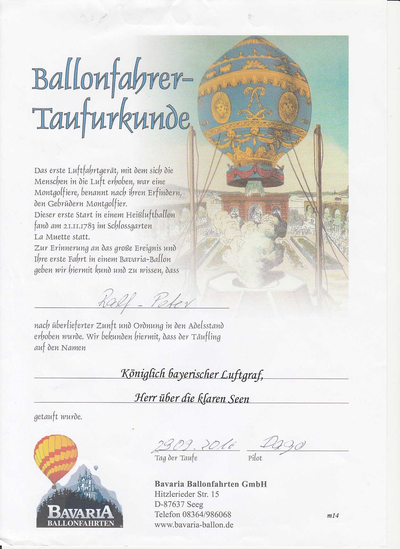 HEISSLUFTBALLONFAHRT zum zweiten: Was es nicht alles gibt! Wir - d.h. meine Familie und ich - sitzen am 28.09.2016 am Frühstückstisch in unserer Pension "Pfeffermühle" in Eisenberg im Allgäu; und meine Frau sagt so vor sich hin:" Schönes Wetter zum Ballonfahren....."Fünf Minuten später taucht am Horizont ein Ballon auf, der ganz in der Nähe landet. Meine jüngere Tochter entziffert die Aufschrift, und mit ihrem Smartphone bringt sie es fertig, am nächsten Tag für mich einen Platz bei der "Bavaria Ballonfahrten GmbH" zu buchen. Wir treffen uns am Schwaltenweiher in der Nähe von Seeg um 07.30 Uhr. Noch ist es recht kühl, als zwei Ballonfahrzeuge eintreffen. Nach der Verteilung der Passagiere auf die Ballons geht es in flotter Fahrt in die Nähe von Wertheim zum Startplatz, der auf einer Kuhweide liegt. Das Equipement wird ausgepackt, wobei natürlich alle mit anpacken müssen. Und dann verrichten Gebläse und Brenner ihren Dienst, bis die Ballons mit heißer Luft gefüllt sind und aufrecht stehen. Damit sie nicht abheben können, werden sie am Abschlepphaken der Fahrzeuge fixiert. Ziemlich gleichzeitig heben dann beide Ballons ab - ein Fehler, wie sich kurz darauf herausstellen soll. Die Fahrt geht über die Baumwipfel in Richtung Grüntensee. Dar Ballon mit dem größeren Korb fährt etwas langsamer als der zweite, in dessen Korb ich stehe. Da sich die Ballons fast berühren, versucht unser Pilot Dago möglichst tief zu bleiben, um Abstand zum vorausfahrenden Ballon mit seinem 600 kg schweren Korb zu bekommen. Wohl etwas abgelenkt durch einen sehr nervigen Passagier aus Berlin, der seit dem Start mit seinem Gequatsche alle Mitfahrerinnen und Mitfahrer strapaziert, sinkt er zu tief , und PATSCH, ist der Korb im Wasser, das dann fast bis zu den Kniegelenken reicht. Ich hatte mich geistig schon auf SCHWIMMEN eingestellt. Komischerweise vernahm ich das Gekreische einiger Mitfahrerinnen gar nicht wirklich intensiv, denn mein erster Gedanke galt der Wasserfestigkeit meines neuen Smartphones, das ich zum Geburtstag geschenkt bekommen hatte. Was man so alles denkt in so einem Moment. Mit "VOLLGAS" schaffte es Dago, den Korb aus dem Wasser zu bekommen: er zog eine riesige Fontaine Wasser hinter sich her......und die Füße aller Passagiere waren mehr als naß bis fast zu den Knien. Da es noch frisch war von den Temperaturen her, war das kein schönes Gefühl. Überall höret man das Geräusch von "Wasser im Schuh". ..... Doch die Konzentration auf die nassen Füße schwand bald angesichts des überwältigenden Alpenpanoramas, an dem wir entlangfuhren. In teilweise flotter Fahrt ging es bis zu 700 m hoch über dem Boden, also ca. 1300 m über N.N., in Richtung Forggensee. Angesichts unserer Wasserstarterfahrung dachte ich laut schon scherzhaft an einen Wasserlandung, was jedoch keiner wirklich komisch fand....Dago setzte den Korb dann absolut sanft und gekonnt nahe Roßhaupten auf eine Wiese, die sogar frei von Kuhdung war. Und dann, wie üblich, mußte die Hülle zusammengelegt und verpackt werden. Packsack und Korb wurden mit vereinten Kräften auf den Hänger geladen. Es folgte die mir schon bekannte Zeremonie nach der Fahrt mit der Erhebung in den Adelsstand. Ich bin nun "Königlich bayerischer Luftgraf, Herr über die klaren Seen". Wenn das nicht zum Eintauchen in den Grüntensee zum Beginn des Abenteuers paßt, dann sage man mir, was besser passen könnte! Alles in allem: ein unvergeßliches Erlebnis: |